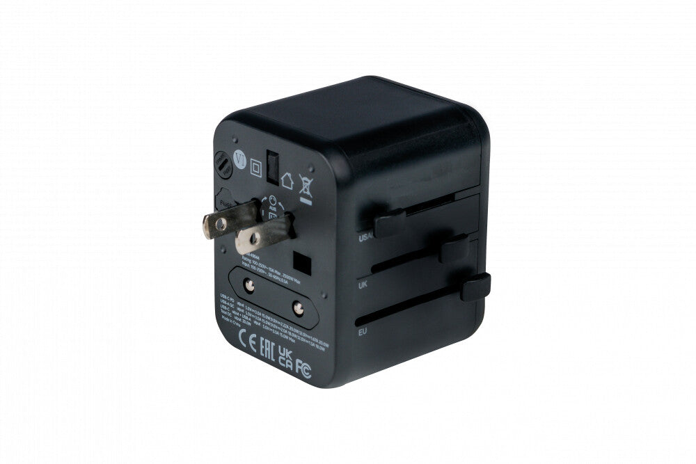 The compact and powerful Universal Travel Adapter allows 3 devices to be charged simultaneously through the AC power socket and the USB-A and USB-C ports.