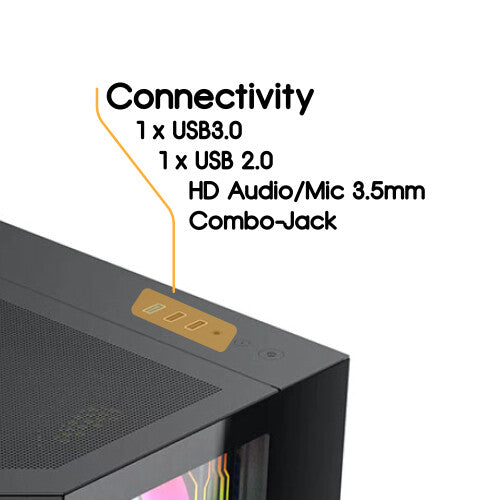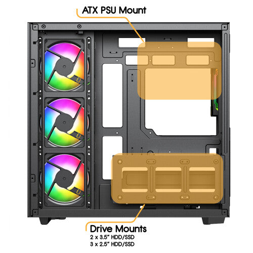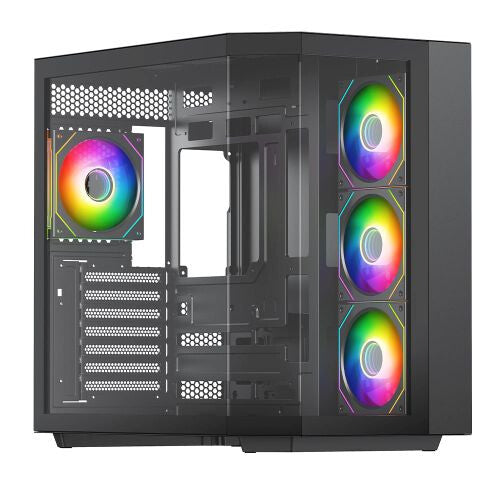 It comes pre-installed with four Infinity02 ARGB PWM fans—one rear exhaust and three reverse-blade side intakes—for powerful airflow and vivid ARGB lighting right out of the box. A 6-port PWM ARGB hub, 3-pin motherboard sync cable, and a remote control for lighting and fan speeds are also included, giving you full control over your build’s appearance and performance.