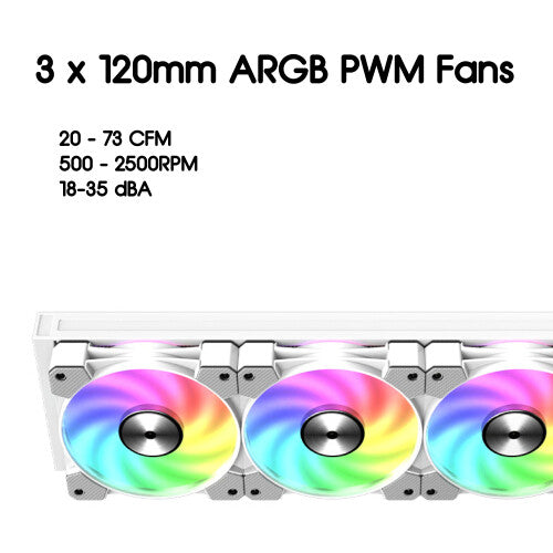 Supporting up to 300W TDP, the Trifrost is built to handle the latest Intel and AMD CPUs with ease. PWM-controlled fans spin from 500–2500 RPM and move up to 73 CFM of airflow, while fluid dynamic bearings ensure long-lasting quiet operation. The robust pump runs at 2500 RPM, delivering a steady 1300ml/min flow rate for consistent heat dissipation.