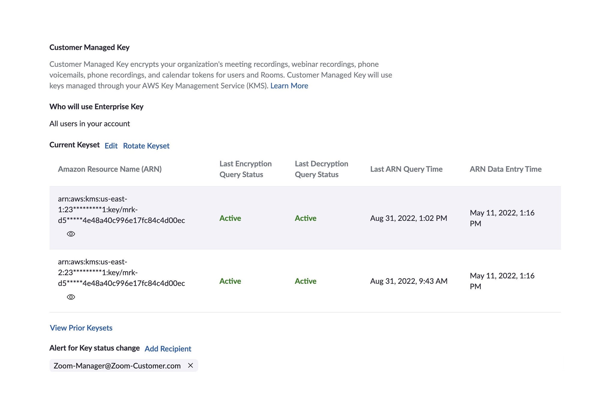 Enroll your encryption keys within your AWS KMS system and monitor their status within the Zoom Admin Portal